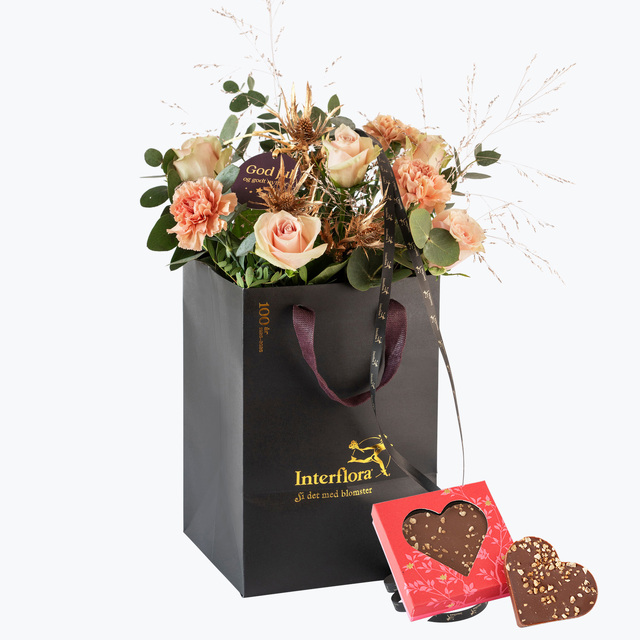 En fin harmonisk blomstrende bukett i lyse delikate toner som leveres i Interfloras eksklusive gavepose. Si det med blomster! Leveres sammen med et deilig nougathjerte.