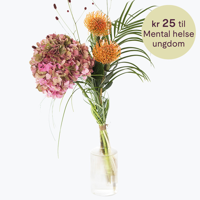 En nydelig kombinasjon av friskhet og omtanke der 25 kr av inntektene per solgte bukett går til Mental Helse ungdom. Når du velger denne hortensia-buketten gir du ikke bare en hilsen til en du bryr deg om, du blir også med på å støtte Mental Helse Ungdom i deres arbeid for å fremme psykisk helse blant unge. Det er en gave som sprer glede til mottakeren - og mange flere.